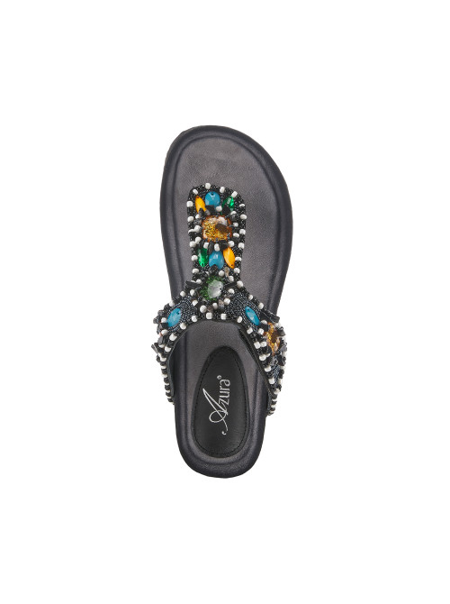 Intricately beaded center strap thong sandal on a super soft padded insole and shock absorbing wrapped wedge. Gorgeous contrasting colors with a hook and loop adjustable top strap.